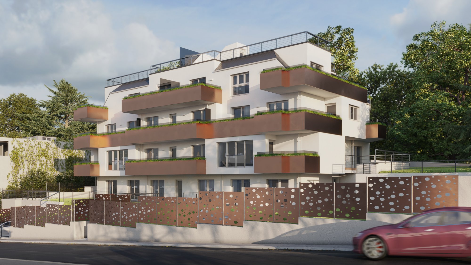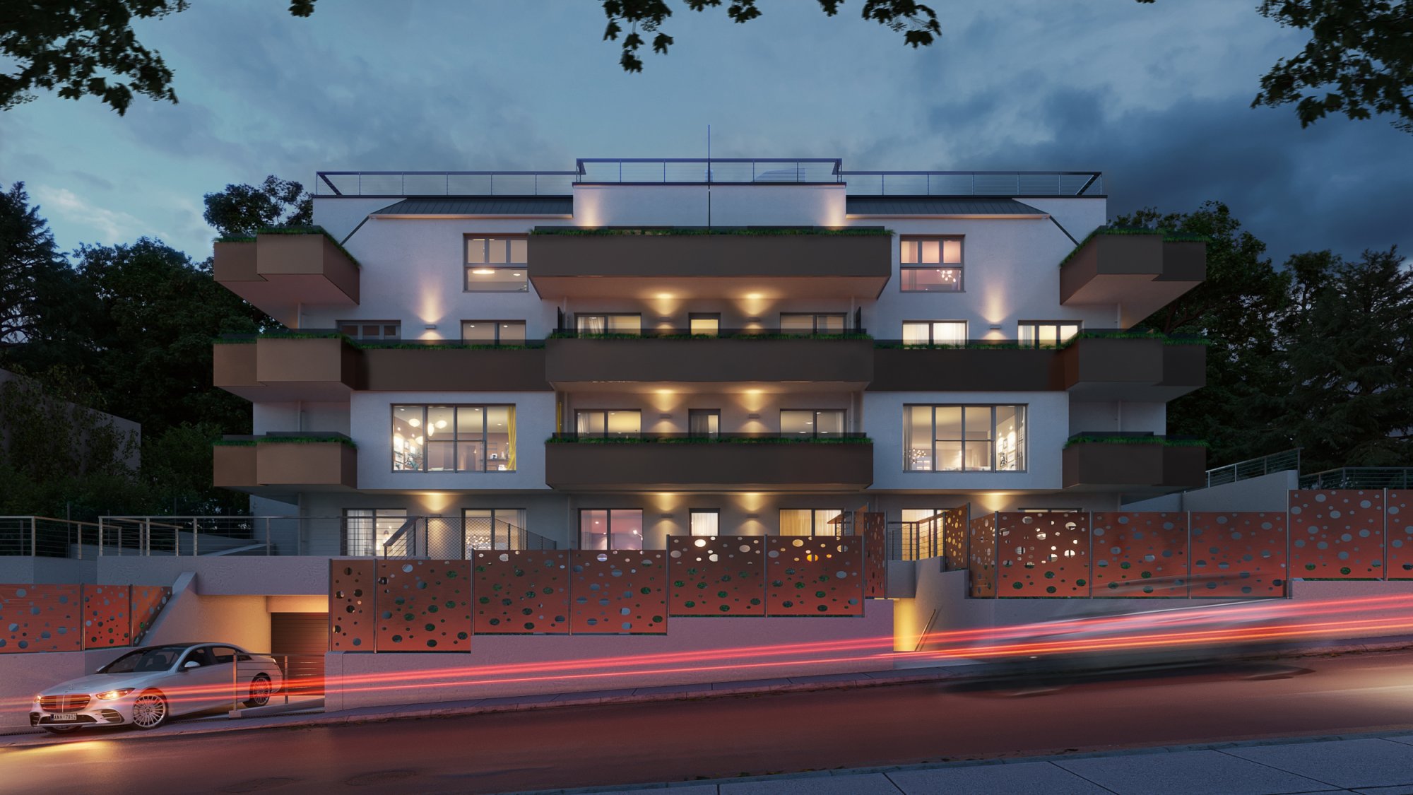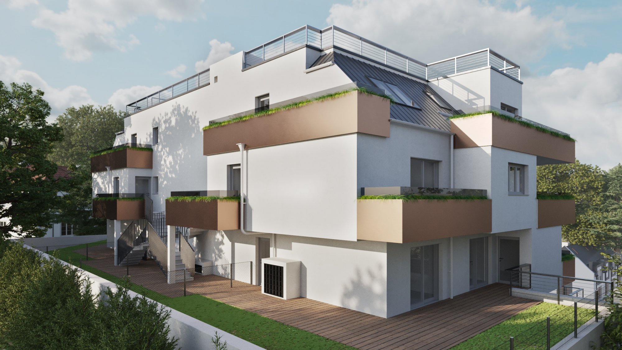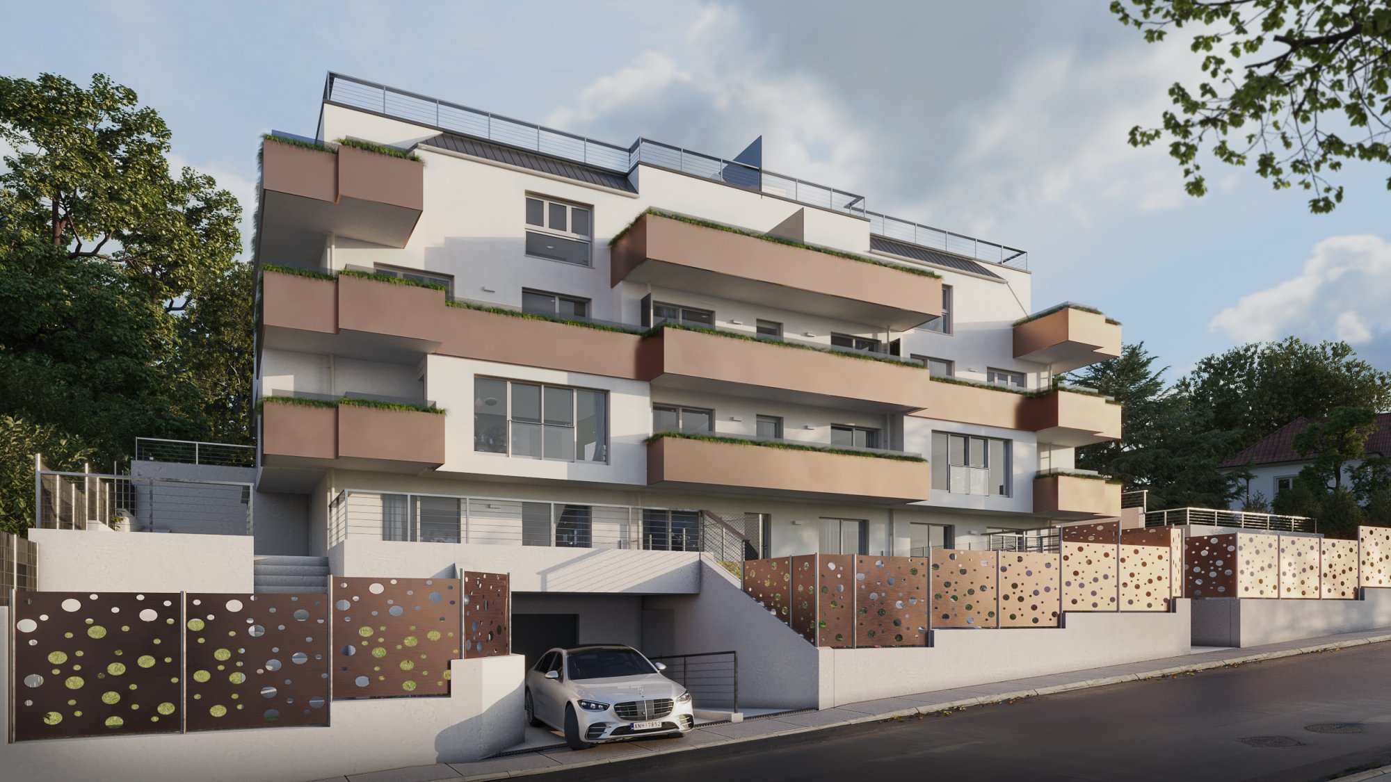 In einer schönen grünen Ruhe Oase gelegen werden Neubauwohnungen errichtet. Die besondere Schwierigkeit bei diesem Projekt lag in der Projektierung der Zugänge und Zufahrten aufgrund der Straßenhanglage und der um 90° gedrehten Grundstückshanglage.